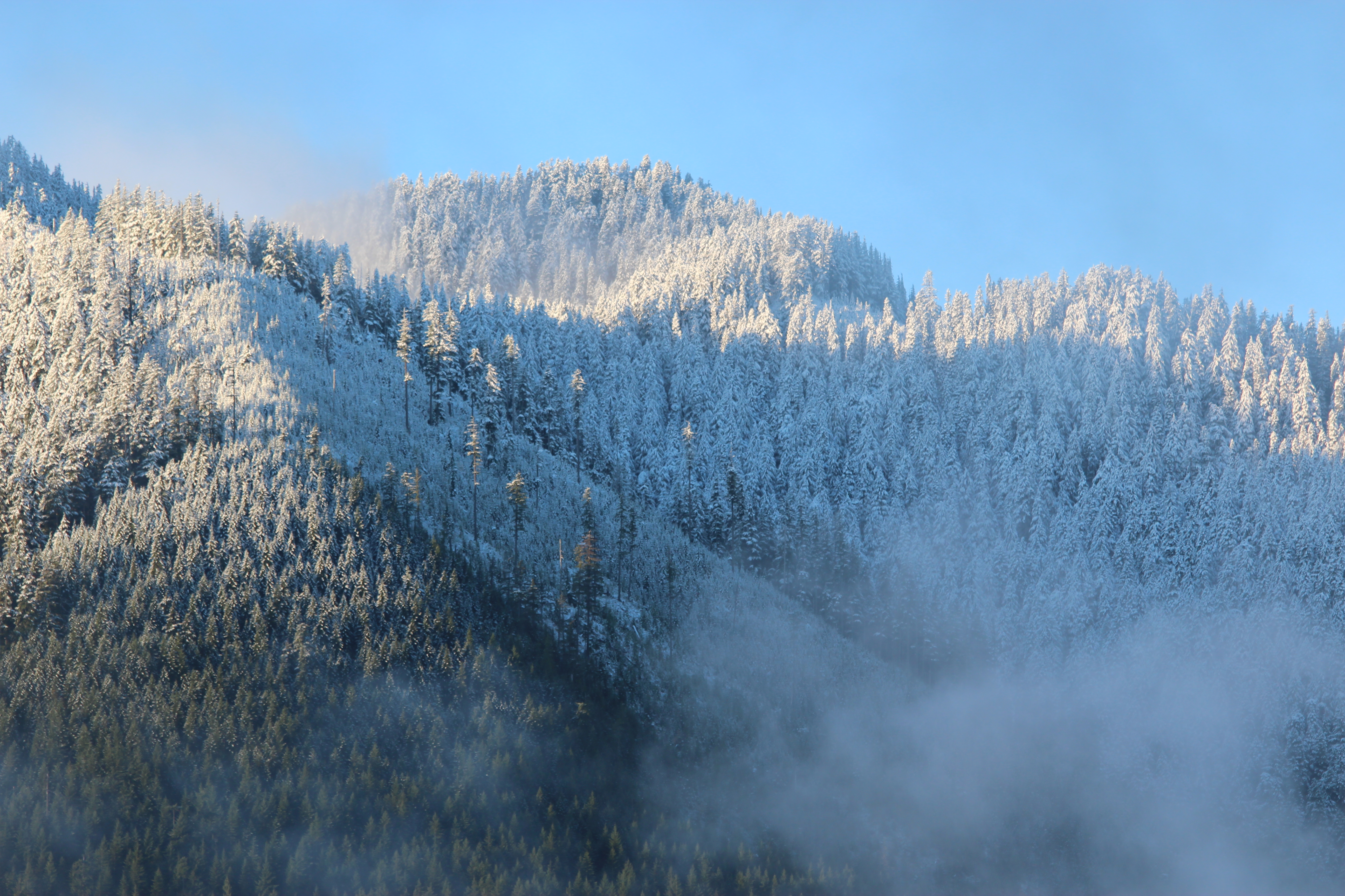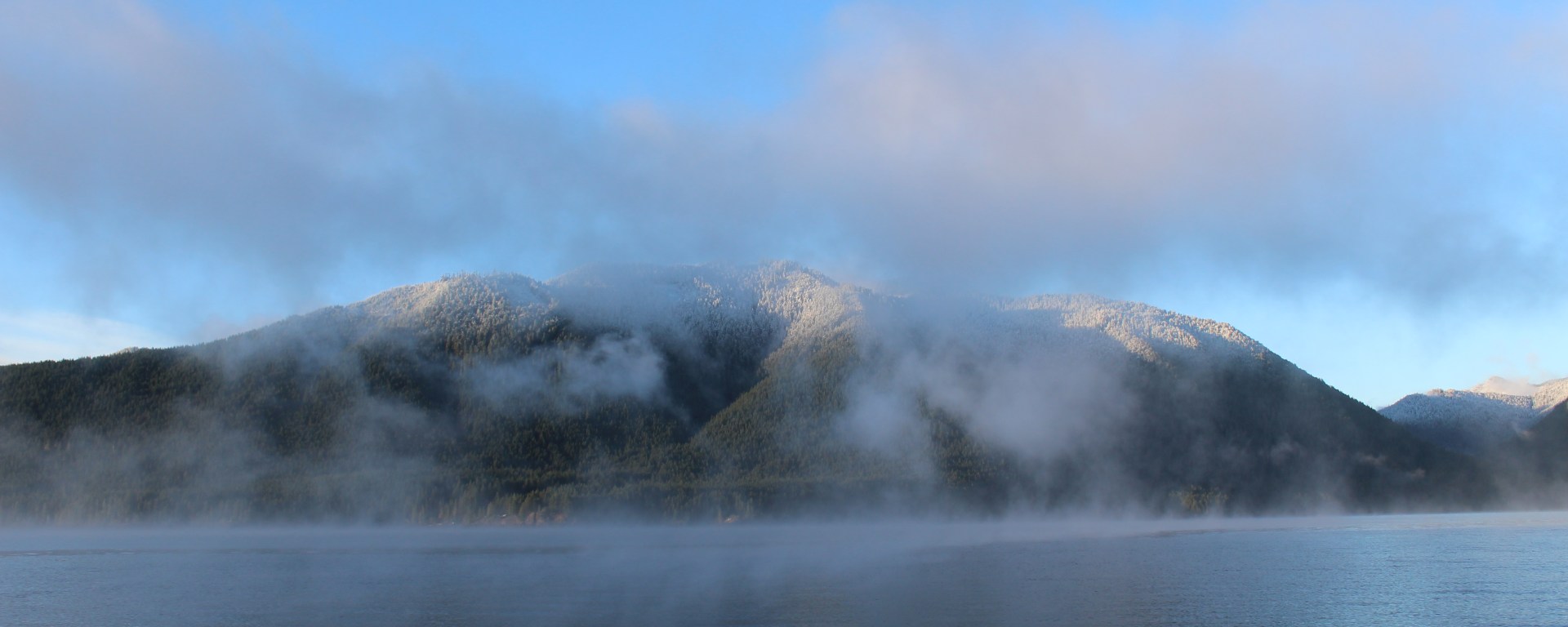 Mid-October: After nearly a week of high wind, we awoke on the last day of our trip to a perfect calm. Pouring a cup of coffee to warm up the chill, I walked down to the lakeshore, and found the first dusting of snow on the mountains, mist rising off the water. Winter coming on, time to say goodbye to the lake for this year. What a morning for a cup of coffee and a quiet stroll!
