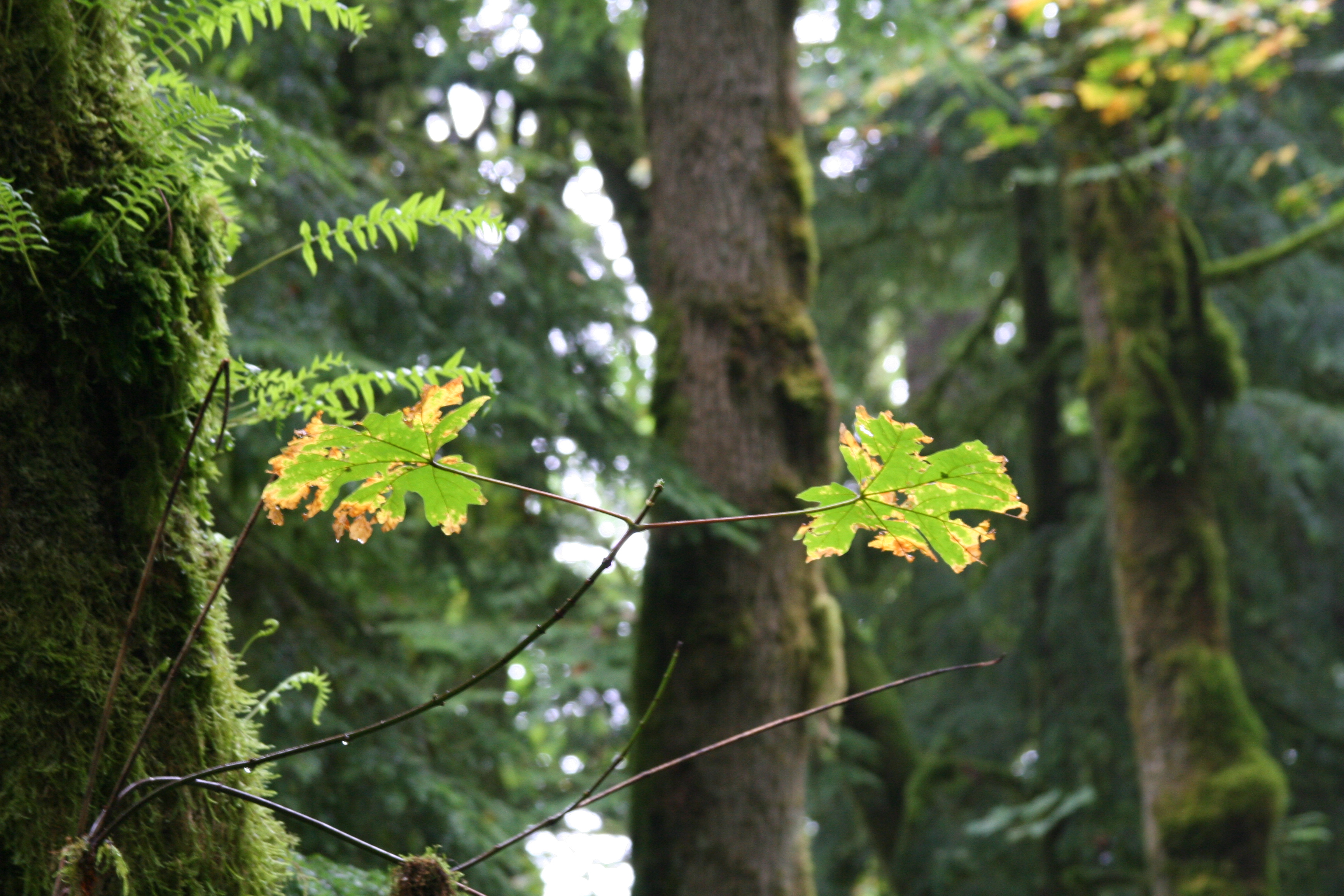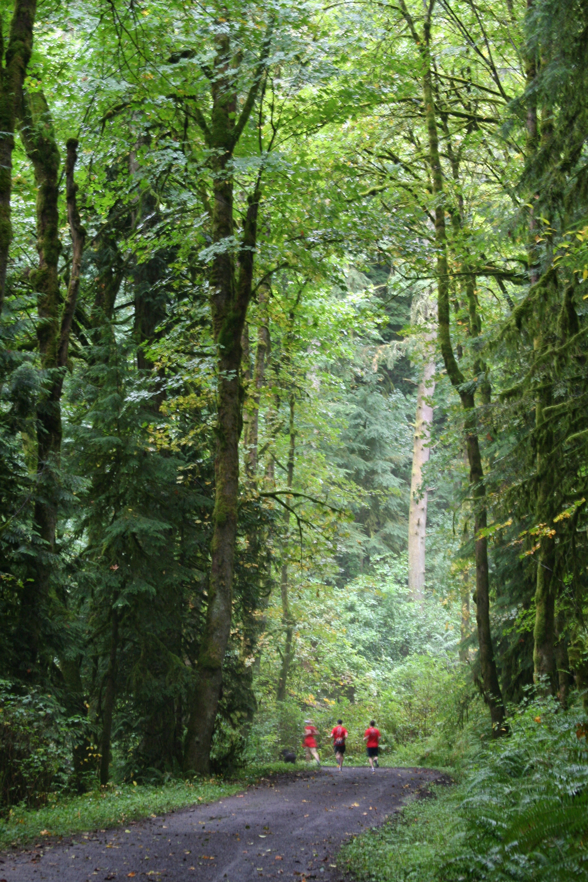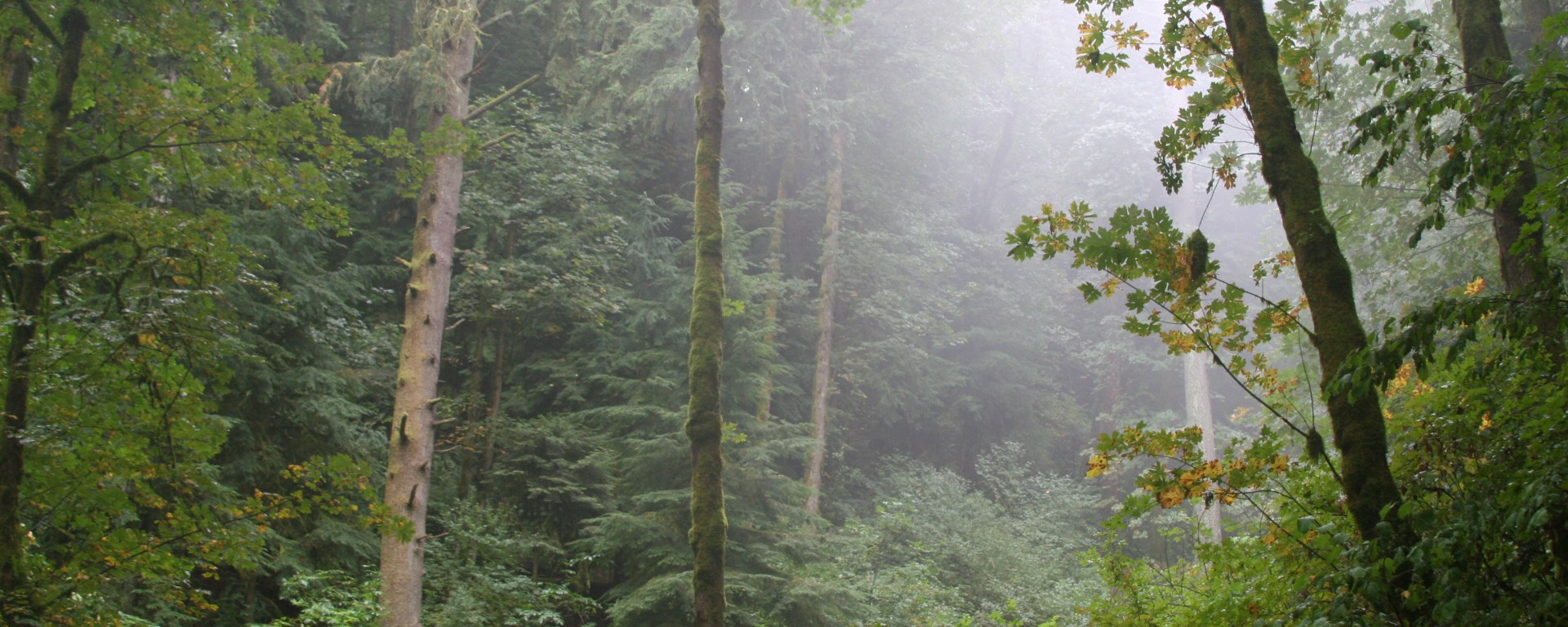 Early fall, the days still hot but the mornings damp, cool, misty. Taking a walk in Forest Park outside of Portland, I am passed by a trio of red shirted runners, gliding down the path. Walking on, I am in silence again. A stretch of the forest opens a bit, and the mist enveloping the green foliage unveils the first signs of fall color.